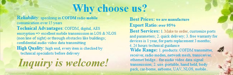Full duplex audio video multi-hop bidirectional Ethernet mesh for data communicationType: IP mesh, wireless mesh, multi-hop mesh, frequency hopping duplexer, multi-hop wireless transceiver, Network Bridge, Ethernet data module.Wireless mesh based on the growing demand of the proprietary RF wireless communications market, our 1stMesh product model SG-SM340 can able to deliver HD video, data and VoIP signals over IP networks in a complex environment with a wide coverage, strong diffraction ability, high transfer rate and self-defined security encryption. The Mesh is suitable not only for point to point / multi-point communication, but also centerless multi-hop ad hoc network. Each mesh rod can access up to 16 nodes. According to the work environment and the number of nodes, SG-MS340 throughput up to 11Mbps, transmit distance can be extended through multi-hop. As Mesh self-organizing / self-healing features make it very suitable for motion surveillance with high quality image and emergency communication.Features:Non-line-of- sight communicationSelf-organizing networkSelf-encrypting security algorithmFrequency can be customized at rang of 100~1000MHz